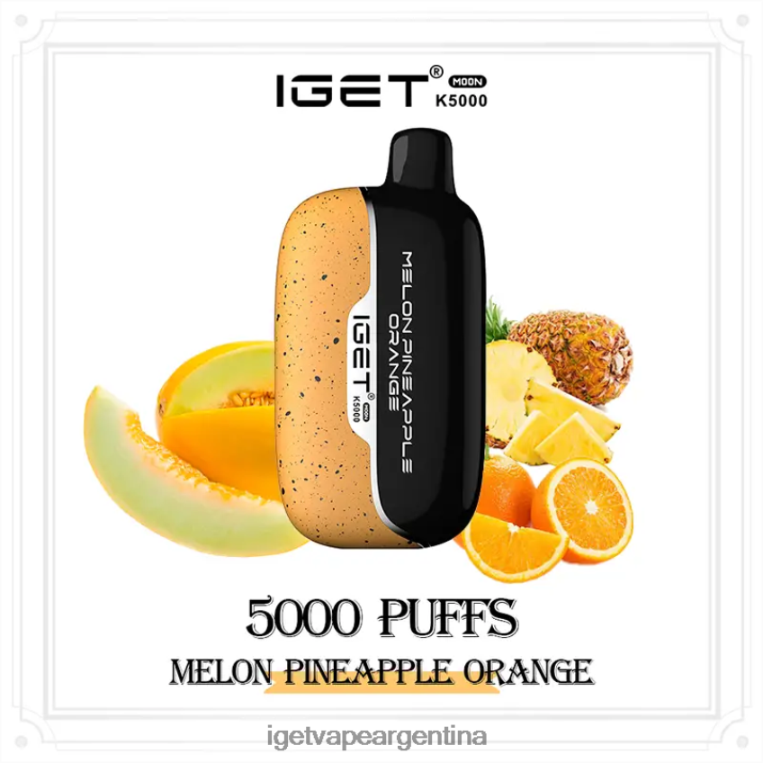 iget moon melon piña naranja combina melón aromático, piña dulce y mandarina jugosa, brindando a los vapeadores un triple placer dulce.